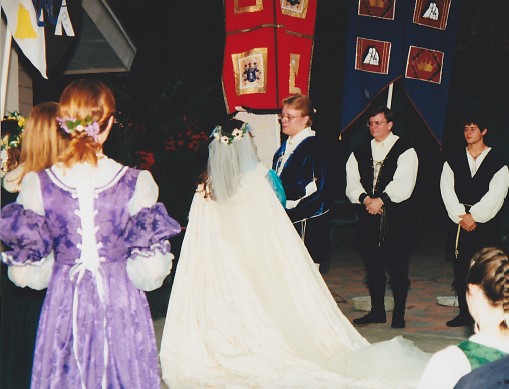 In Costume Corner – Renaissance Wedding, Part 1, I talked about the main modification to the dresses, the separate underskirt. The underskirt was made with silkessence and a rounded elastic neckline. We made a minor adjustment with the gauntlets, the floating sleeve pieces. I opted to eliminate them from my dress but the bridesmaids liked them so they were left in their outfits. The pattern had them attach with grommets and ribbon or cording. Our original experience with setting the grommets was not successful so we opted to go with out them. My bridesmaid in the purple dress, Bea*, added elastic to hers which worked great. I wanted to add elastic to the others but the outfits were already with the bridesmaids. We were in the final stretch and due to the time crunch, schedules, and geography it just didn’t happen. The gauntlets ended up a little slouchy over extended wearing but it was a little thing, so I didn’t stress about it.