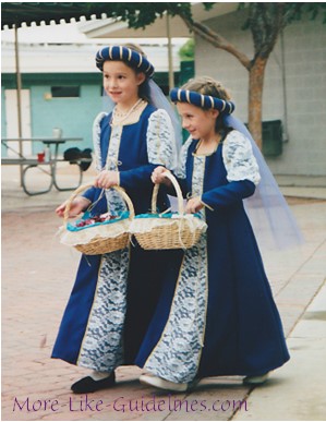 I made a fifth bridesmaid dress for a friend that took on the job of stage manager the day of the wedding. She made sure that everyone was in the right place when the wedding started. Each bridesmaid and groomsman knew when to start down the aisle and my two flower girls felt very comfortable knowing they had someone right there to help them know when to go. My two nieces that helped to carry my train down the aisle had similar dresses with simple muslin underskirts and no gauntlets.