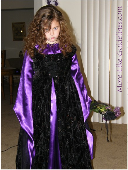 In 2009, we dressed as vampires for Halloween. Scarlet wore my mother’s overdress over a new purple underdress and looked quite tragic and soulless. If you click on the photo you can see the glittery pattern a little better.