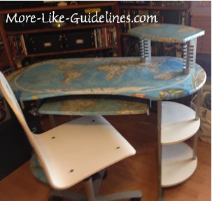The second map was one that we’d used a lot while we talked about world history.  If you look closely at the keyboard shelf you can see the fold lines and even the yellowing from the old cellophane tape we had used to fix it years and years ago.  I used this map for the keyboard shelf, the lower left shelf and the small shelf on the desktop.