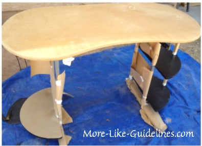 I moved the desk outside, removed the keyboard shelf and small desktop shelf.*  Next, I peeled the vinyl off and then sanded the top and lower shelf.  I also sanded the black shelves lightly so that the paint would adhere to the vinyl.  At this point, I also taped off the metal legs to protect them from white spray paint.  This took forever and in 104 degree (F) temperatures was not actually all that fun.